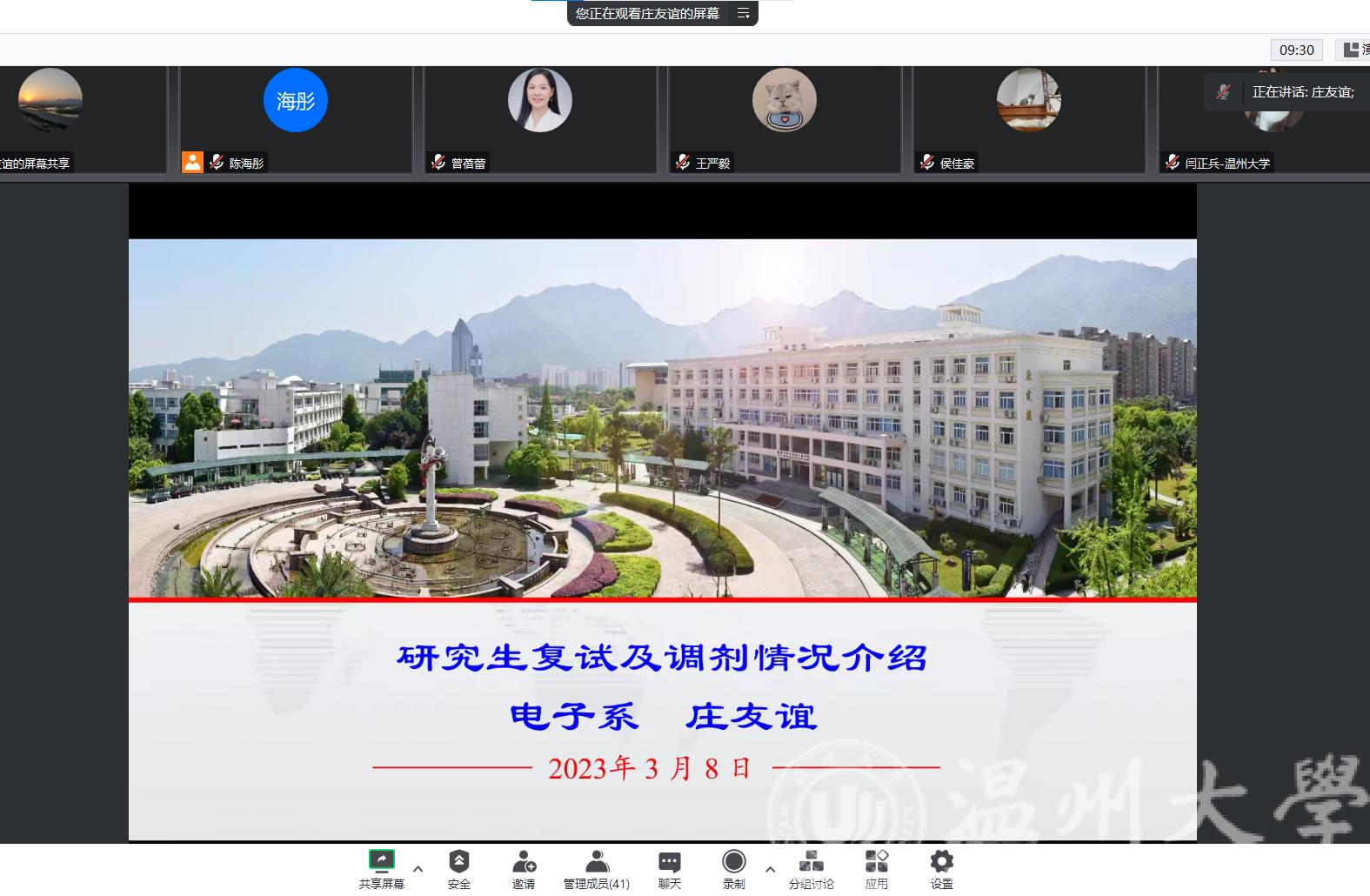 为进一步帮助买球官网2023届考研学子掌握复试技巧及调剂方法,增强复试信心,3月8日晚上18:30,买球官网召开2023年考研复试指导暨经验分享的线上会议。学院党委副书记曾蓓蕾、学院挂职副院长张鉴,电子系主任庄友谊、电气系专业老师闫正兵,2019级辅导员潘龙飞,考取浙江大学、上海电力大学等高校的三位往届优秀校友,以及2023届考研学子出席本次交流会。会议由学工办辅导员陈海彤主持。