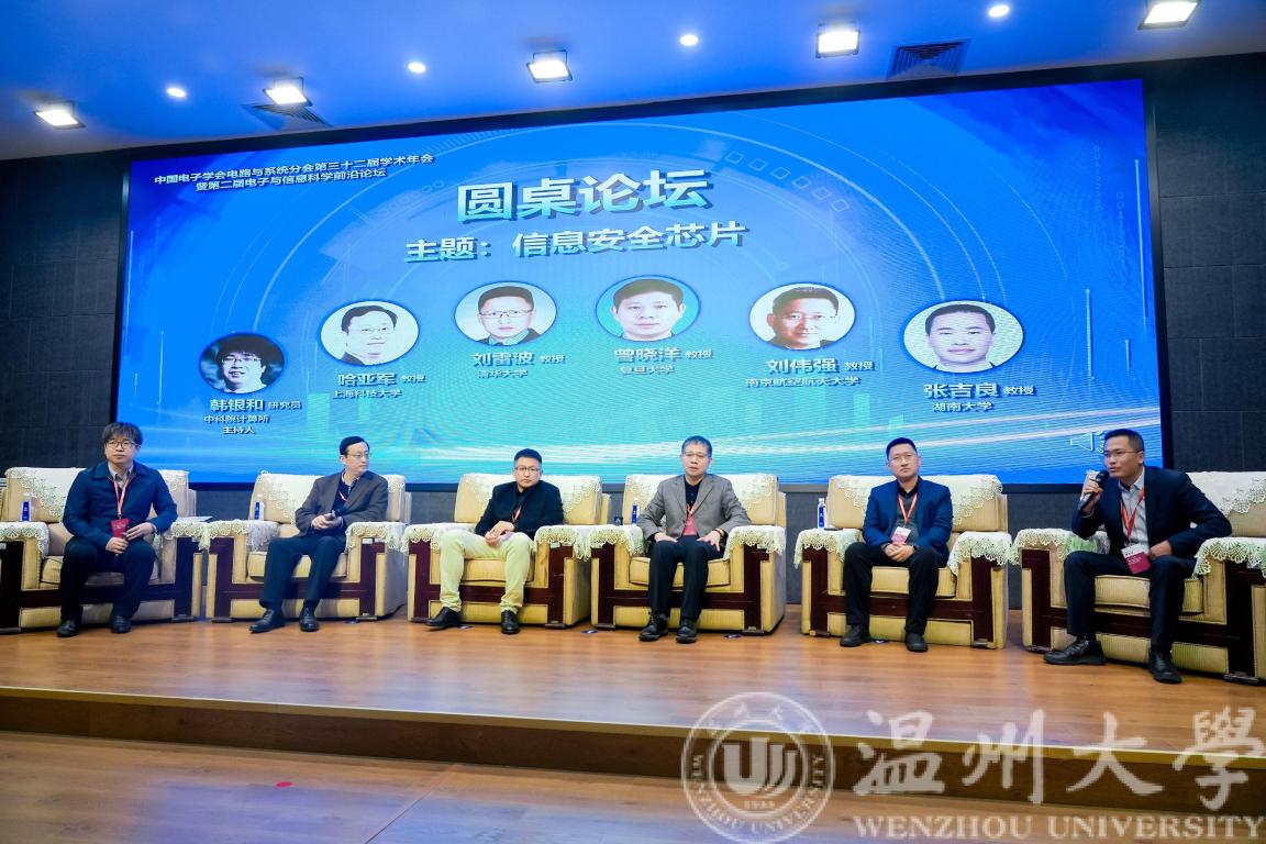 大会圆桌论坛环节,在中国科学院计算所韩银和研究员的主持下,上海科技大学哈亚军教授、清华大学刘雷波教授、南京航空航天大学刘伟强教授、复旦大学曾晓洋教授、湖南大学张吉良教授围绕信息安全芯片主题做交流和分享。