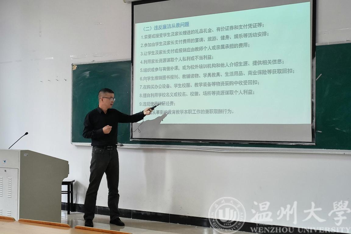 会上,党委书记李方强传达了《浙江省教育厅办公室关于印发<全省教育系统师德师风问题整治工作实施方案>》以及《正规外围买球十大平台师德师风问题专项整治工作实施方案》的通知精神,他指出,学生安全和师德师风是学院建设事业的“1”,其余都是“1”后面的“0”。如果没有这个“1”,再多的“0”都会变得毫无意义。因此,切实加强师德师风建设是学院建设的首要任务。