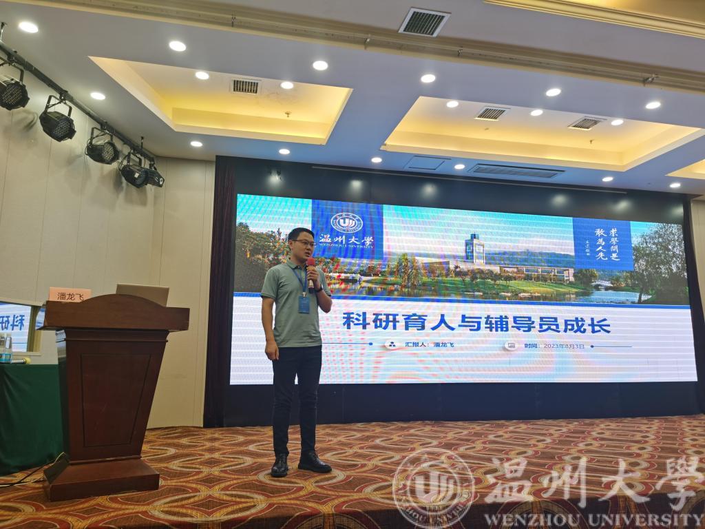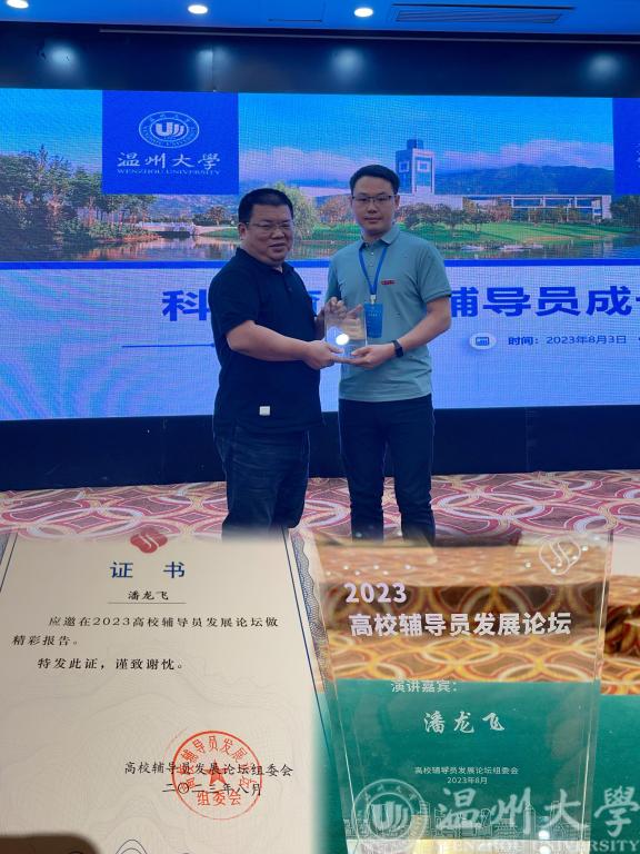 潘龙飞老师报告的题目是《科研育人和辅导员成长》。他的报告主要从以下四点出发:第一,介绍了温州地方文化特色和学校发展情况,重点围绕学校90周年校庆和承办第九届互联网+大赛等出发,还介绍了学校近几年在挑战杯、互联网+等科创领域取得的成绩;第二,介绍了他所在岗位所负责的科创、团学等工作情况;第三,介绍了我校在辅导员队伍建设上的一系列举措,包括坚持8年开展辅导员思享会等;第四,分享了入职四年来,他个人在辅导员素质能力大赛、案例大赛、微党课大赛、科研课题、挂职锻炼等方面的收获。潘老师的分享赢得了与会辅导员的一致好评,组委会为他颁发了证书和纪念牌。