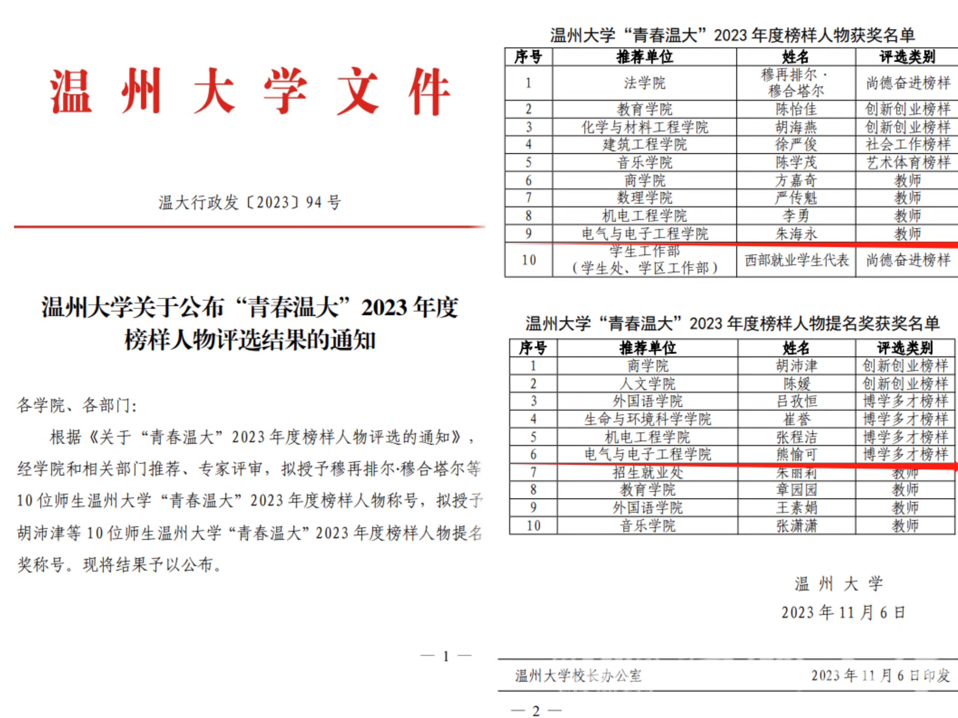日前,正规外围买球十大平台“青春温大”2023年度榜样人物评选结果出炉,买球官网副院长朱海永教授荣获“青春温大”·2023年度榜样人物,2023届毕业生熊愉可荣获年度博学多才榜样提名奖。