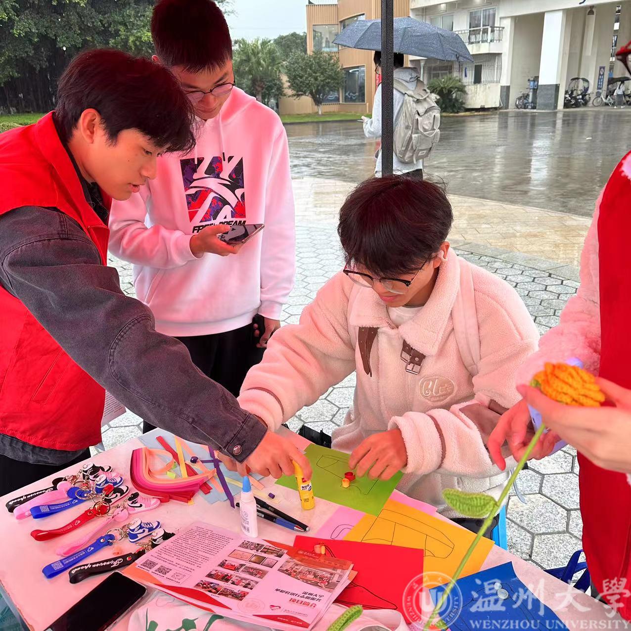 天空虽然下着蒙蒙细雨,但丝毫没有抵消学生们志愿服务的热情,师生志愿者在雨中热情邀请来往同学参与活动。参与者拿出手机转发“寻找身边的单脚残疾人士微刊”,即可获得“单脚鞋银行”特别文创作品“单脚鞋”一个;还有不少同学都参与了衍纸画的手工制作,在纸上留下了他们的创意与对残疾人的关心。此次活动,还将青苗残疾人之家由残疾人亲手制作的毛线花工艺品,带到现场进行义卖。同学们买去残疾人士手工制作的工艺品,收获一份喜悦,奉献一份爱心,为助力残疾人创业增收贡献了力量。活动的最后,汇聚着大家对残疾人关怀的爱心被一张张贴纸“点亮”,传递着我们对残疾人的温暖。