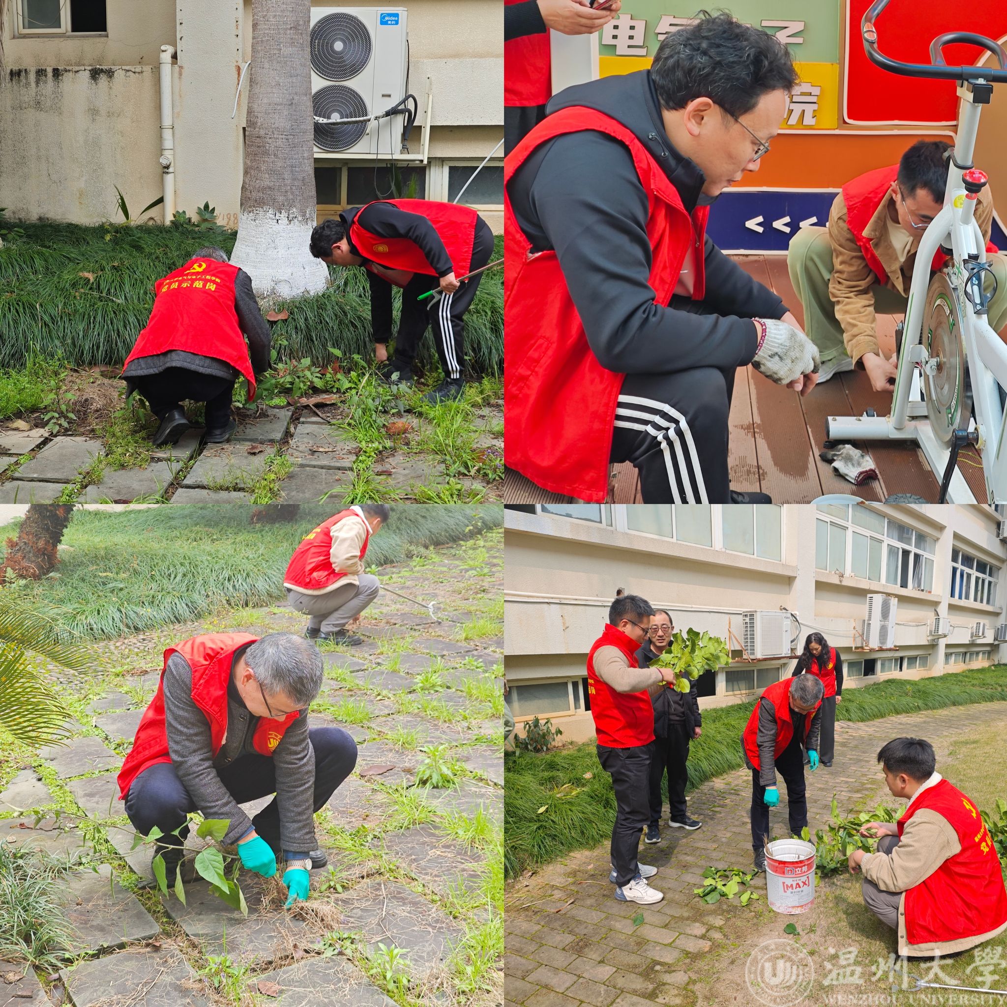 各位党员同志分工明确,除草、捡拾垃圾开展的井然有序,有技能特长的党员还维修保养了学生运动休闲的器械。经过行政教工党支部各位党员同志的辛勤付出,学院大门和休闲区域焕然一新,满地杂草、隐蔽垃圾不见了,取代的是干净整洁的地面和恬静美好的休闲空间。