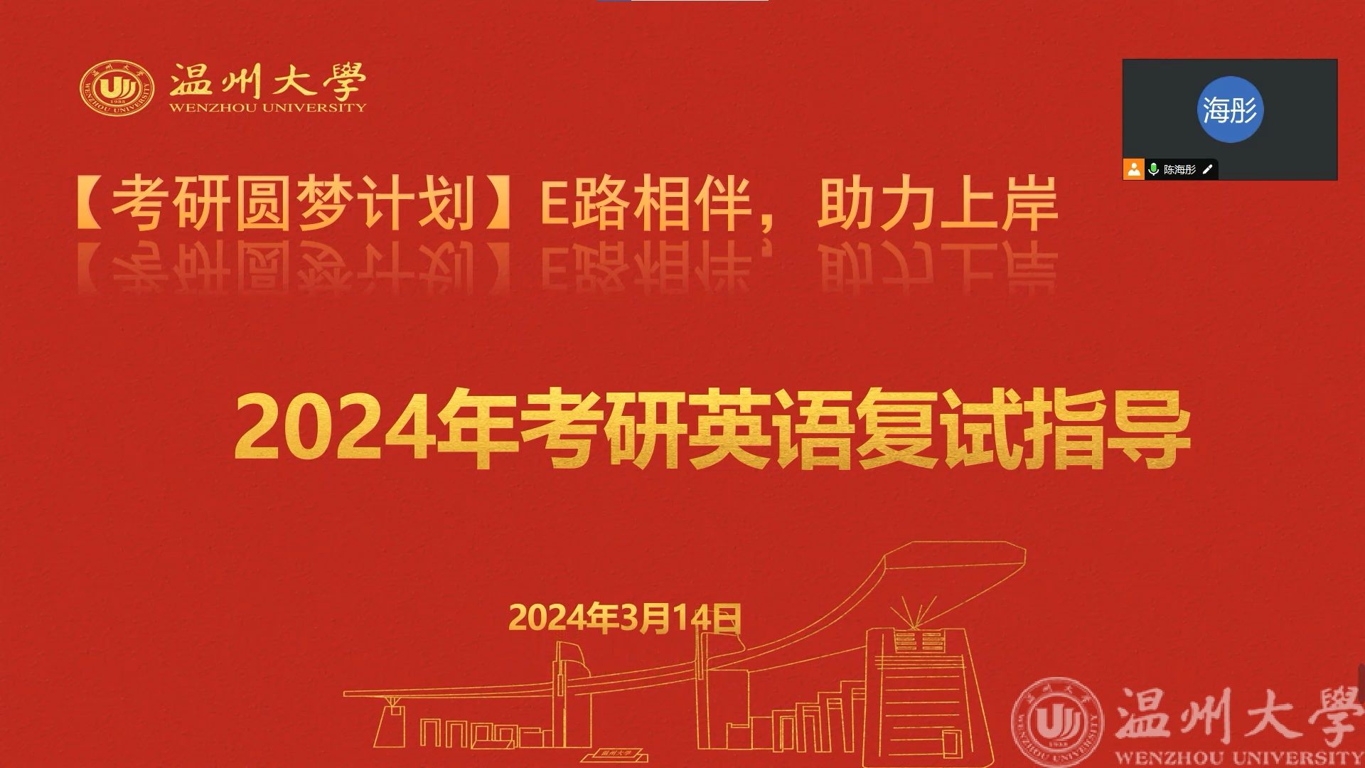 为帮助2024年考研学子轻松应对复试中英语面试环节,助力学子顺利上岸,3月14日晚上19:30买球官网在线上开展2024年考研复试英语面试培训活动。在外国语学院“E路有你”教工第二党支部书记王素娟老师的精心组织与安排下,辅导团队的王廷达、张娟两位老师通过线上视频会议的形式,为同学们提供了一对一的模拟面试辅导。