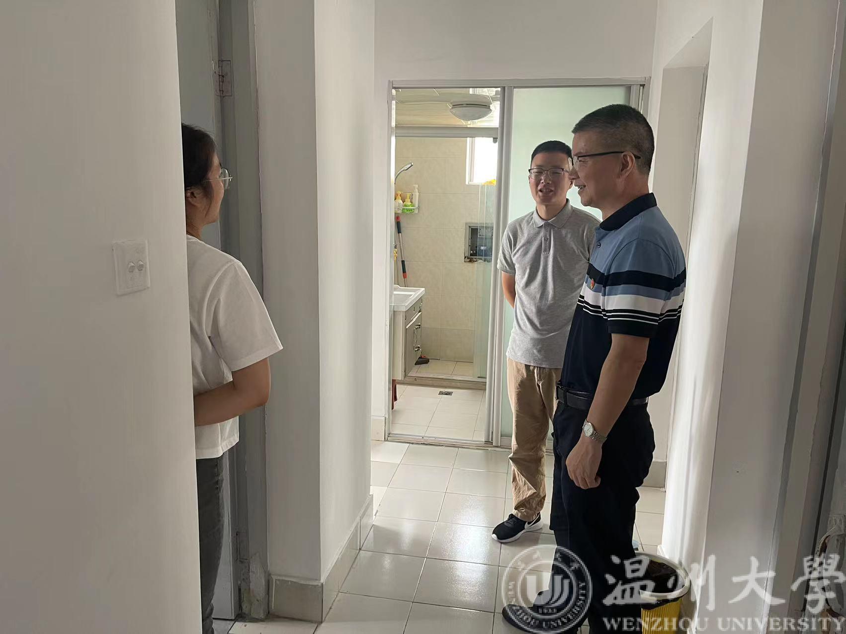 走访中,李方强书记与新进教师进行亲切交谈,关心他们的住宿和生活情况,还适应新的工作环境吗?工作、生活上有没有困难?出行是否便利?这些简单、亲切的话语让新教师们倍感温暖!随后,查看了公寓的家具配置、厨卫设施、空调水电等,耐心的听取新进教师们的心声及他们的生活、工作情况。