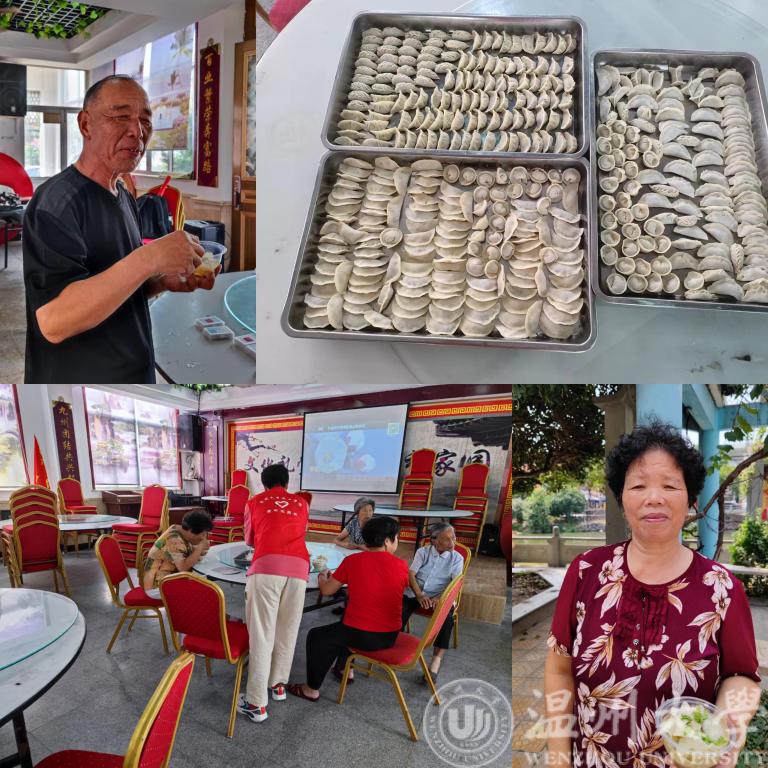 早上9:00整,志愿者们便从学校出发,一同前往舜岙村敬老院。参与活动的志愿者们配合默契,行动井然有序。首先,志愿者们在活动场地进行布置,打扫卫生,为紧接着的活动做准备。活动开始了,志愿者们密切分工、积极行动,有的人前去与老人用温州话聊天,让老人们倍感亲切;有的人前去洗菜;有的人在准备馅料;有的人在旁拍照留念……包饺子的过程中,全体志愿者一起动手合作,活动井然有序。饺子煮好了,志愿者们又热情地邀请现场的老人们一起品尝,并得到了老人们的一致好评。在活动的最后,志愿者们邀请老人与自己合影留念。敬老院负责人对志愿者们的志愿行动予以充分肯定,而老人们也对此赞不绝口,同学们在欢声笑语之中不知不觉度过了美好的一天。