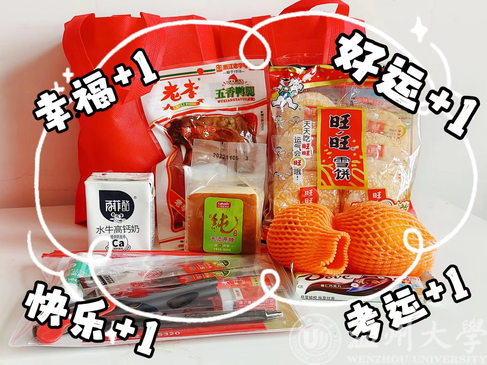 2022年11月24日,距离2023年全国硕士研究生招生考试还有30天,考研也进入紧张的冲刺阶段。为鼓舞考研学生信心,增强考试信心,十大买球平台排行榜开展2023届考研慰问活动,为广大备战考研学子送上“考研大礼包”,为他们鼓舞打气,加油助力。“考研大礼包”含有考试必备的涂卡笔、橡皮、小刀、胶棒等文具用品,还有寓意“糕”中的蛋糕,大“鸡”大利的鸡腿,考运“旺旺”的旺旺雪饼,“橙”功上岸的橙子,思路纵享“丝滑”的德芙巧克力等。