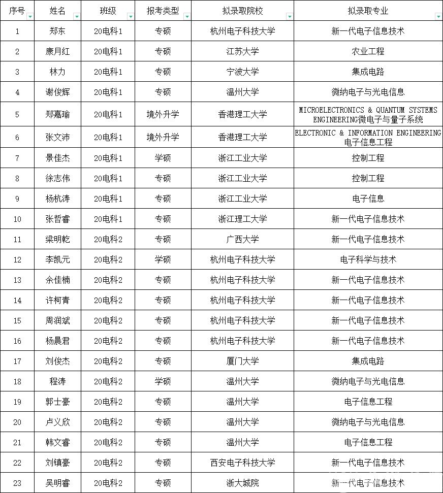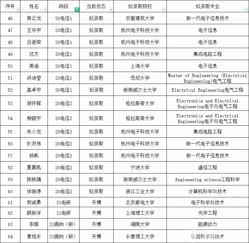 根据《十大买球平台排行榜“聚创奖学金”评定办法》文件精神,结合买球官网实际,学院将本年度考取硕士研究生、博士研究生及出国留学的64名同学直接评定为第五届“聚创奖学金”升学奖获得者。现将名单予以公示,请同学们核对录取的院校、专业以及类型,有误请在下方收集表填写中反馈。公示三个工作日,如有异议请于公示期内与学工办联系。