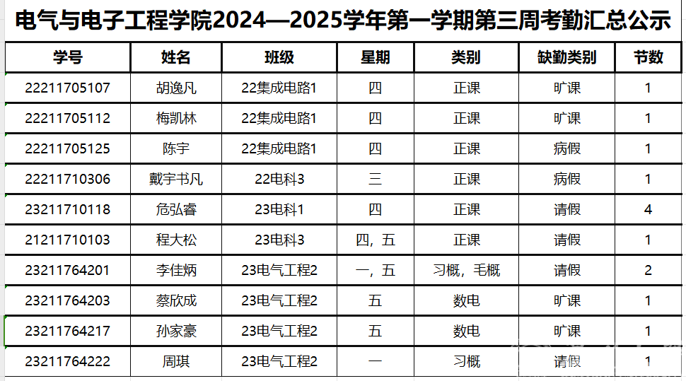 第三周早晚自习缺勤及课堂出勤情况如下: