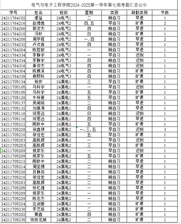第七周早晚自习缺勤及课堂出勤情况如下: