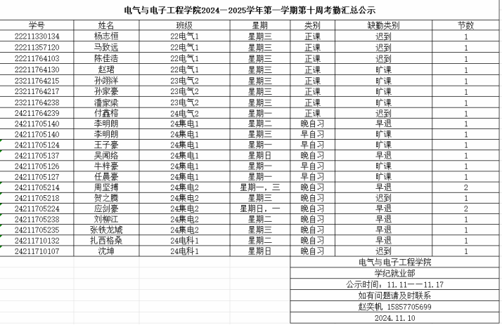第十周早晚自习缺勤及课堂出勤情况如下: