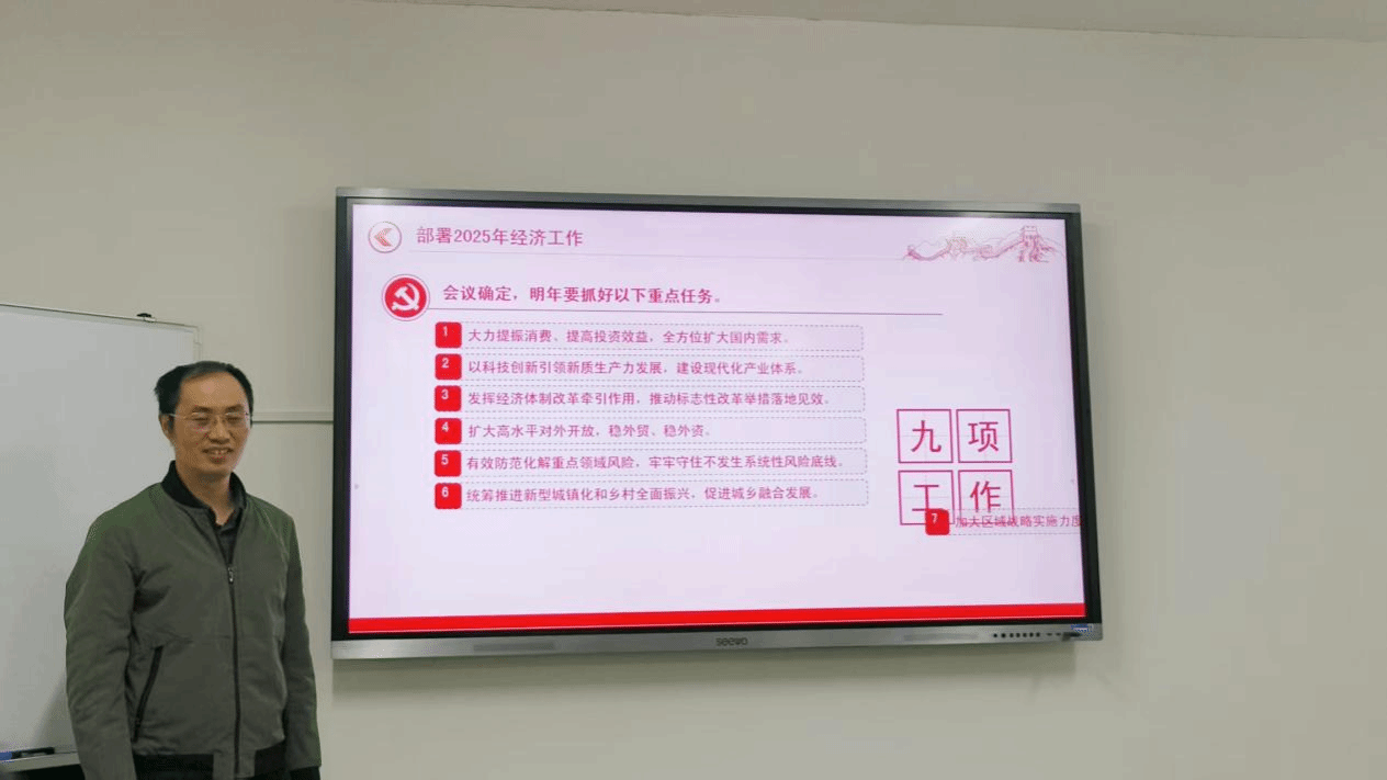 组织委员李忠同志为全体党员作了题为“深入学习贯彻中央经济工作会议精神”的党课辅导。他从会议的背景、主要内容及重要意义三个方面对2024年中央经济工作会议精神进行了深入解读。