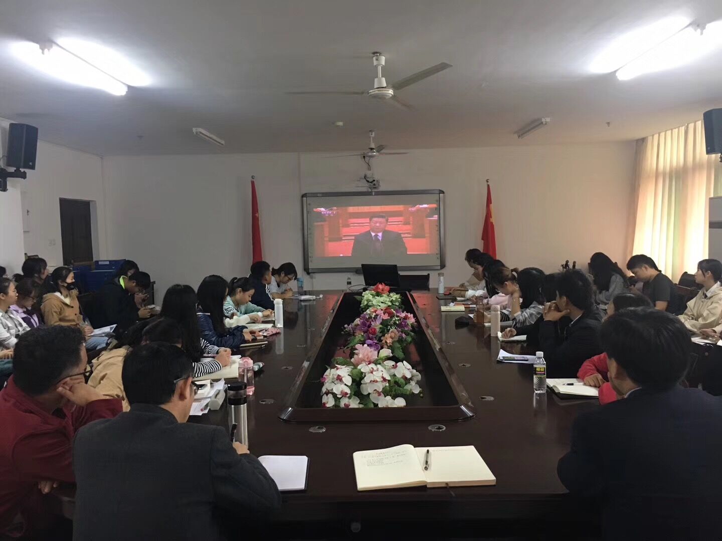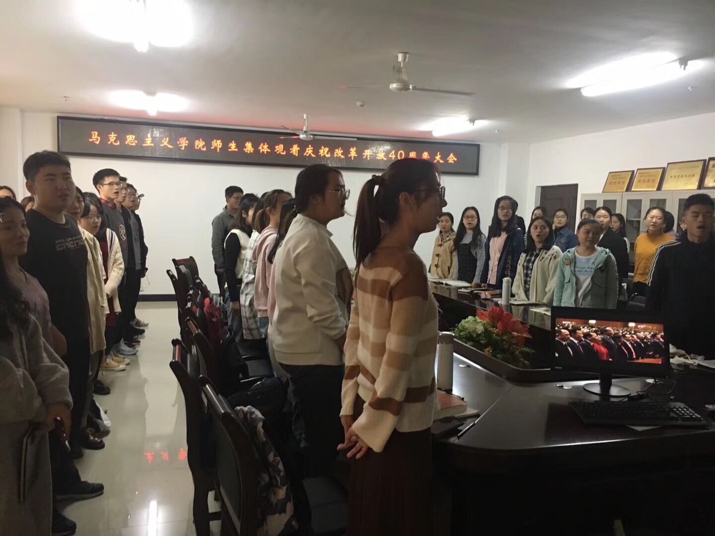 12月18日上午,米兰官网组织师生代表于社科楼A311集中观看“庆祝改革开放40周年大会”直播实况。院领导张井富、吴朝阳,部分教职工和学生共100多人全程观看庆祝大会。