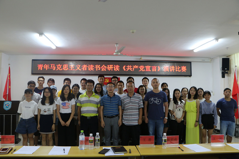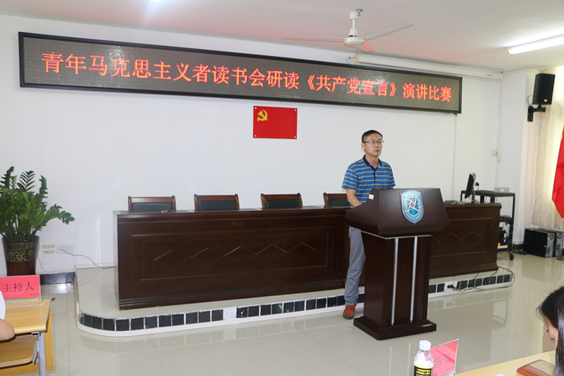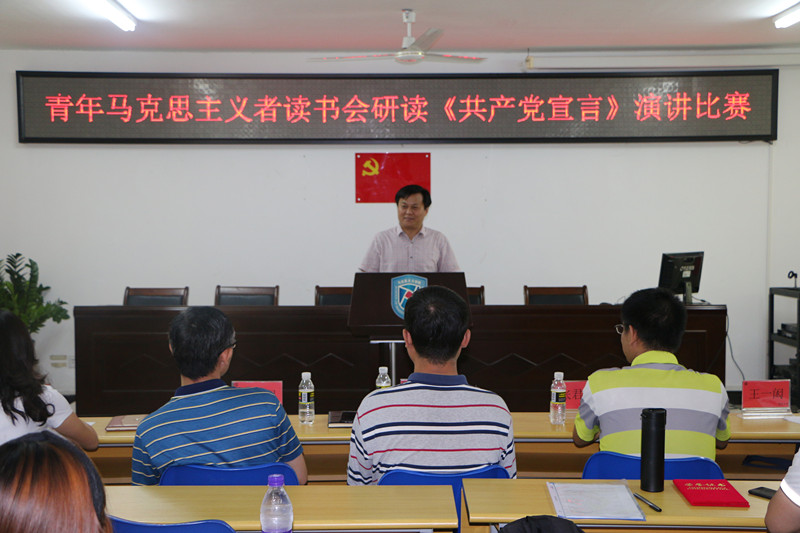 为纪念《共产党宣言》发表170周年,促进广大同学深刻感悟和把握马克思主义真理力量,提升马克思主义理论素养和语言表达能力,米兰milan官方网站青年马克思主义者读书会以重温《共产党宣言》为主题组织研读原著、撰写心得、公开演讲系列活动。5月12日下午,研读《共产党宣言》演讲比赛在社科楼A315隆重举行。米兰milan官方网站院长李辽宁出席活动并讲话,教务处副处长吴朝阳、米兰milan官方网站副院长王善、米兰milan官方网站教师王一闳、张君成、周郭军担任比赛评委。