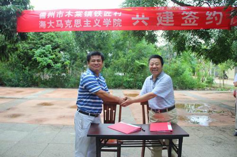 下午1点,社会实践教学队伍到达了享誉海内外的“一村一品”社会主义新农村典范——儋州市木棠镇铁匠村。在铁匠村的文化广场,铁匠村的李巨川主任介绍了铁匠村的基本情况,张云阁副院长在讲话中感谢铁匠村对大学生实践教学活动的大力支持,并对同学们的参观考察提出了具体要求。随后,张云阁副院长与李巨川主任共同签定了“米兰milan官方网站思想政治理论课铁匠村社会实践教学基地共同建设协议”,并为基地揭牌。在铁匠村的会议室,张云阁副院长还接受了海南旅游卫视的采访。