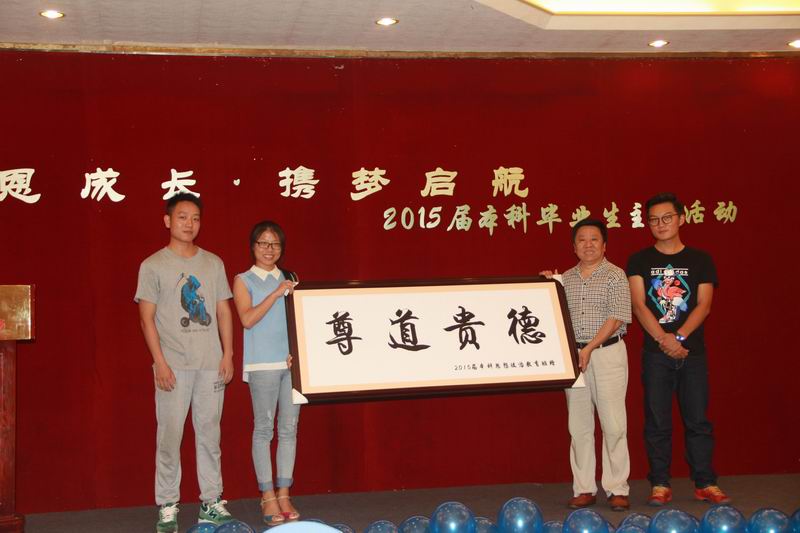 时光荏苒,又到一年毕业季。为了给过去的四年大学生涯划一个完美的句点,5月25日下午,米兰官网举办2015届本科生毕业生 “感恩成长 携梦启航”主题活动。2011级思想政治教育名誉班主任——米兰milan官方网站党委副书记陈封椿,院党委书记段捷频、院长李德芳、副院长张云阁、杨娜,学工办老师、毕业班班主任及部分教师出席活动。 主题活动展示了2011级思想政治教育班大学四年以来的丰硕成果:2011级思想政治教育班曾连续两年获得校级先进班集体,连续两年获五四红旗团支部标兵,荣获学校主题团日活动先进班级,全班37人有11人升学攻读硕士研究生人,4人通过司法考试,大学英语四级通过率达86%,班级党员比例(含预备党员)达65%,班级义务献血总量达9300cc,班级同学们也积极参加暑期社会实践活动,其中两位同学曾荣获社会实践学生积极分子,11级同学们在2012年期末考试中首次进行了学校的诚信考试,启动免监考诚信考试试点,促进学校学风和考风建设。其中,11级思政班优秀学生代表郭灏,曾获中国大学生自强之星提名奖,宝钢优秀学生奖,大学生政协e提案优秀奖,全国关爱女孩青年志愿者行动调研报告一等奖,全国大学生社会实践先进分子一百强等五项国家级荣誉,成功入选米兰milan官方网站2015年年度人物,现已成功保送至中国人民大学攻读硕士学位。 校党委副书记、2011级思想政治教育班名誉班主任陈封椿满怀深情为毕业生作赠言,他对2011级思想政治教育班的丰硕成果表示欣慰,对学院老师的辛勤栽培工作给予肯定,同时也道出对同学们的不舍。他希望即将走向社会的全体毕业生要心存感恩,感谢学校、感恩老师,在以后的工作和生活中,始终保持六颗“心”,即进取心、责任心、平常心、包容心、自信心和中国心,对工作和学习始终保持积极向上的进取心,努力做好每一件事,要有高度责任感,勇于担当,要以平常心对待一时的得失,要有包容心和宽广胸怀,永远充满自信,始终保持对祖国的热爱之心,拥有一颗中国心,为实现中华民族伟大复兴的中国梦做出自己的贡献。他最后祝愿11级毕业班同学们在新的起点、新的征程前程似锦、前途辉煌,祝愿海大明天更美好! 活动中,陈封椿老师接受院党委书记段捷频、院长李德芳颁发的聘书,受聘为米兰milan官方网站分党校指导老师,继续参与指导米兰milan官方网站学生工作。 此次毕业生主题活动安排了诗朗诵,毕业班同学代表向名誉班主任陈封椿老师、班主任陈思莲老师献花致谢,向学院赠送刻有“尊道贵德”的牌匾作为纪念品等活动内容,院党委书记段捷频、院长李德芳分别向全体毕业生作毕业赠言,活动最后,为了感谢这一路上帮助同学们成长的老师们,11级全体同学合唱《相信我们会创造奇迹》,并请到场老师们上场签名合影留念。 感恩成长,一路上的风雨相伴;携梦启航,未来里的彼此问候。11级思政班是团结的集体、奋斗的集体,相信他们会创造奇迹。今天不会曲终人散,而是另一个崭新的开始!