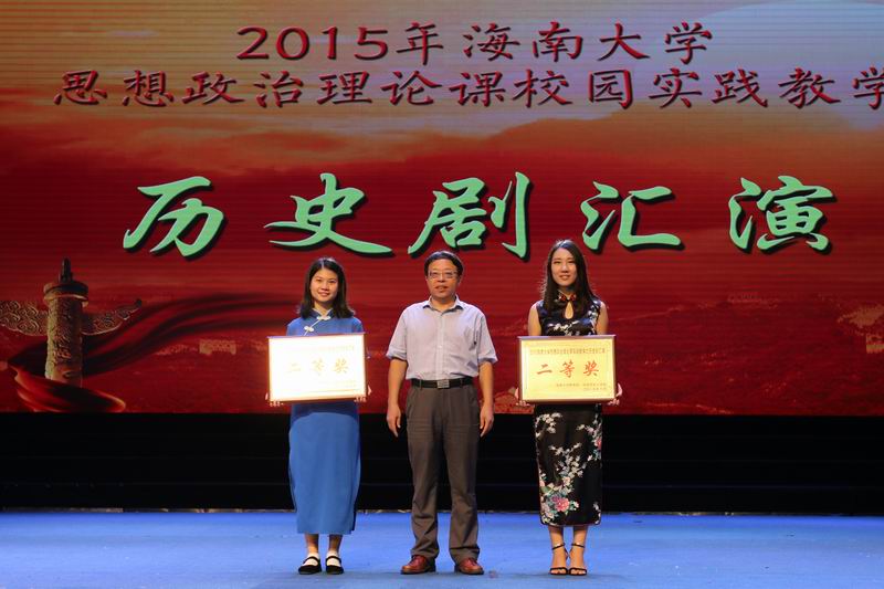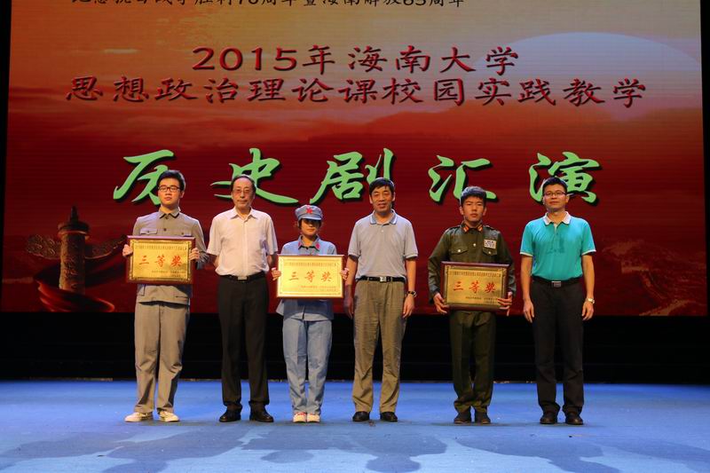 6月2日下午,由我校米兰milan官方网站主办,以纪念抗日战争胜利70周年暨海南解放65周年为主题的思想政治理论课校园实践活动——历史剧汇演在思源学堂举行。海南省委宣传部副部长郭志民,海南省委宣传部理论处处长温龙、海南省教育厅思政处处长文强,我校副校长王崇敏出席活动,来自全省18所高校思想政治理论课教学部门负责人及骨干教师60余人参与了现场观摩。 历史剧表演活动在《中国近现代史纲要》课堂上已经开展了3个月,此次参加汇演的6个剧目是从2014级不同专业的8000多名大学生自编、自导、自演的354个剧目中精选而出的。剧目主题鲜明,选材合理,内容积极向上,意义深刻。同学们表演形象逼真,动作到位,神态自然大方。演出过程中剧情衔接良好,整体效果佳,观众不时爆发阵阵掌声。 汇演结束后, 海南省委宣传部副部长郭志民和米兰milan官方网站副校长王崇敏分别为获一、二等的同学颁奖,海南省委宣传部理论处长温龙、海南省教育厅思政处处长文强和我校教务处处长欧阳克毅共同为获三等奖的同学颁奖,欧阳克毅对汇演进行了精彩的专家点评。 此次活动吸引了多家媒体的高度关注,新华网、中新网、海南日报均对此事进行了报道。兄弟院校观摩教师对此项活动寄予了高度的评价。学校党委领导对活动的开展给予关心和指导,校党委办公室、宣传部、教务处、艺术学院、团委、艺术团、网教中心等部门给予了大力的支持与配合。 学校教务处处长欧阳克毅、校党委宣传部副部长谭勇、米兰milan官方网站领导班子全体成员和部分学院分管教学副院长参加了活动。 据悉,米兰milan官方网站思想政治理论课教学团队经过多年理论研究与实践探索,成功构建了“一主三辅”实践教学模式,2014年,该项目入选教育部思想政治理论课教学方法改革择优推广计划。目前,该项目是海南省委宣传部和米兰milan官方网站共建米兰milan官方网站的重要内容,是海南省教育厅重点推广项目。此次的历史剧汇演是“一主三辅”实践教学模式中“校园实践”教学的重要内容。