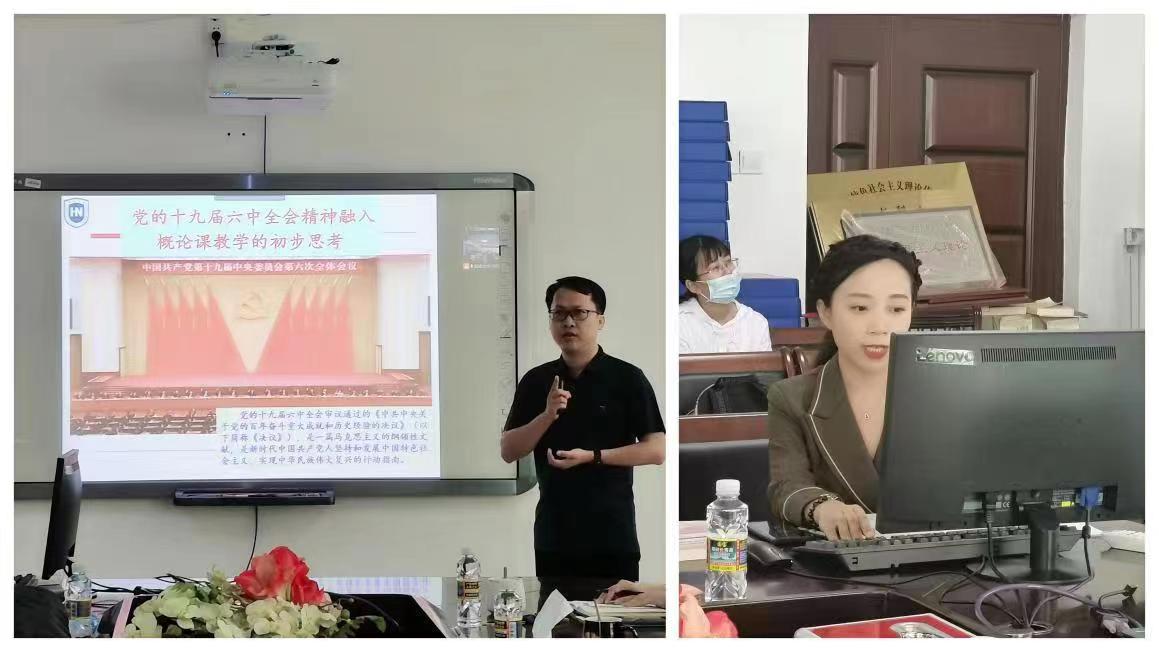 在《概论》课集体备课会现场,于赫老师结合十九届六中全会精神、通过思维导图探讨了“习近平新时代中国特色社会主义思想及其历史地位”“从何而来、缘何而新、伟力何在?”。龙借琼老师着重展示了如何深化十九届六中全会精神于《概论》课教学中,每章均有切入点,总计51个,较为全面地进行了融入,突出了思政课教学的导向性、理论性、时代性。说课结束后,分别进入了“评课和讨论”环节,老师们讨论热烈、发言积极,提出了不少有创新、有见地的意见,如赵福生老师围绕习近平总书记在海南考察调研的重要讲话精神,提出要把种子安全、粮食安全、海洋安全、开放战略等及时融入思政课教学中;宋才增伟老师提出了社会主义“五个版”观点等等。
