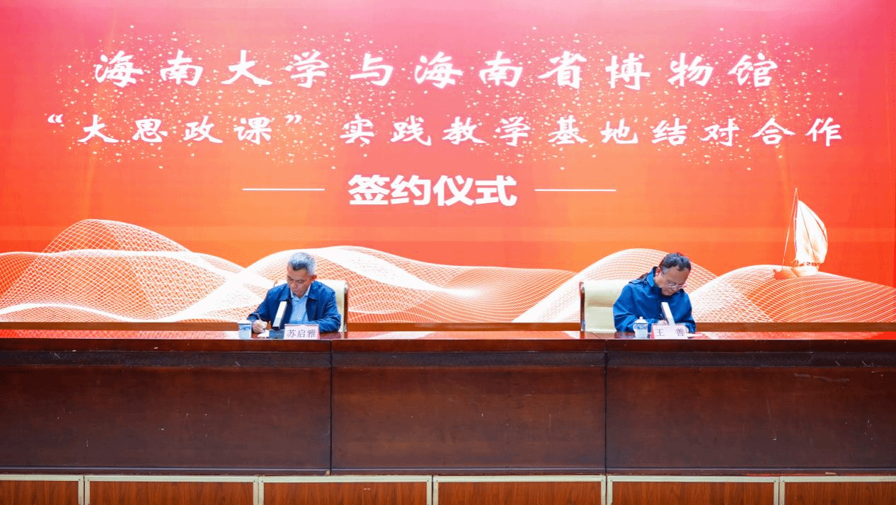 仪式中,海南省博物馆馆长苏启雅与米兰milan官方网站副院长王善共同签署《“大思政课”实践教学基地结对合作协议》,并为“大思政课”实践教学基地揭牌。