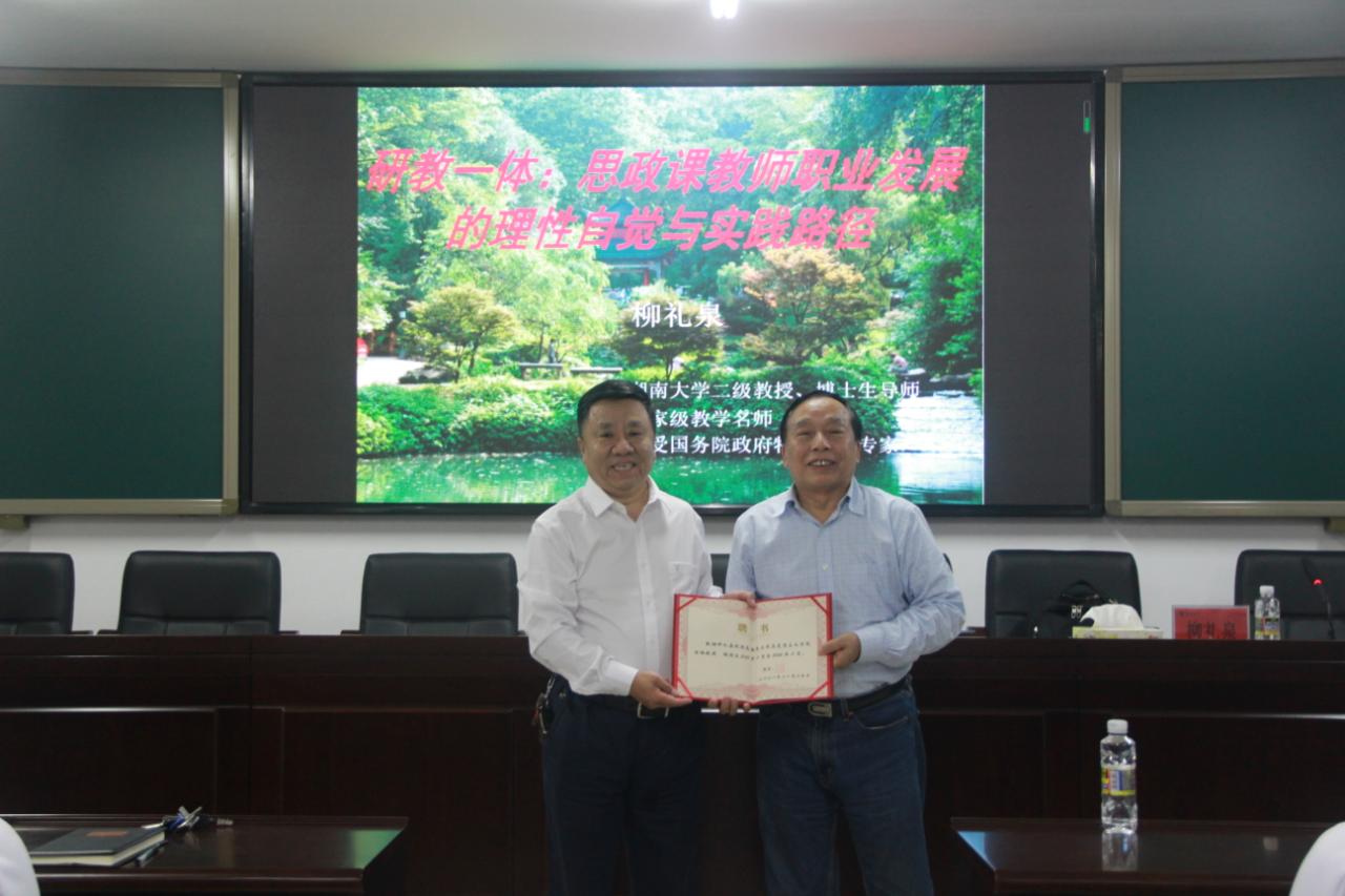 11月19日晚上,湖南大学教授、博士生导师、国家级教学名师柳礼泉在社科楼A309为米兰milan官方网站师生作了关于“研教一体:思政课教师职业发展的理性自觉与实践路径”的学术报告。米兰milan官方网站院长张云阁教授主持报告会,并为柳礼泉教授颁发米兰milan官方网站“特聘教授”证书。