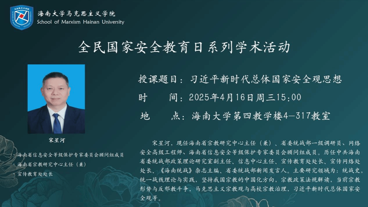 2025年4月16日下午,米兰milan官方网站邀请海南省信息安全等级保护专家委员会顾问组成员宋星河,以“习近平新时代总体国家安全观思想”为主题,从历史文化、风险挑战与实践路径三个维度为学生开展讲座。